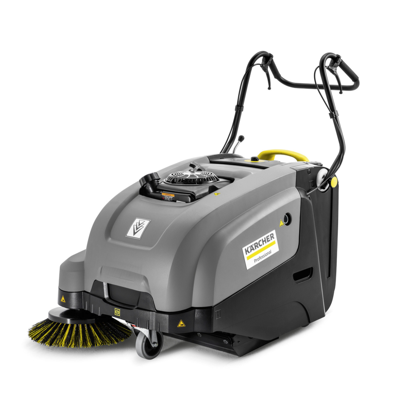 vacOur KM 75/40 W G push vacuum sweeper is powered by a reliable, low-emission and powerful Kohler petrol engine with 3.3 kW, which naturally complies with all applicable emission regulations. This makes it perfect for fast and thorough cleaning of outside areas larger than 600 square metres, such as car parks, playgrounds or other municipal spaces. Perfect cleaning results are ensured by the overhead sweeping principle with connectible side brush, tool-free sweeping surface adjustment and a main sweeper roller that can be changed with no tools required. The powerful suction effectively prevents dust dispersion, while efficient cleaning of the flat pleated filter ensures constant suction power. The clever EASY Operation operating concept, the movable 40-litre waste container with trolley system and the integrated traction drive with infinitely adjustable sweeping speed ensure maximum user convenience while working and therefore enable long applications with the very compact and manoeuvrable KM 75/40 W G without tiring.